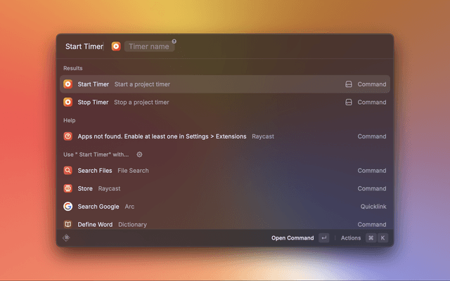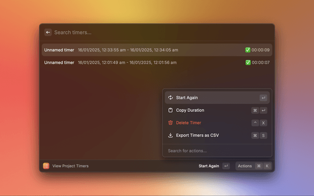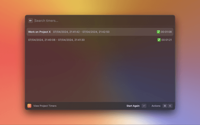 Start, stop, and save countdown timers, directly in Raycast, with no external dependencies.