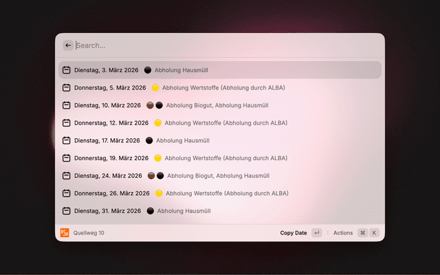 ⌘C⌘⇧,For the Collection Calendar command, open the extension preferences and enter your Berlin street name and house number. The Search Waste command works without any configuration.