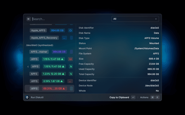 The usage is fairly intuitive. Each disk has multiple actions in Raycast which are self-explanatory and change based on the type and status of the disk/volume. Just try it!