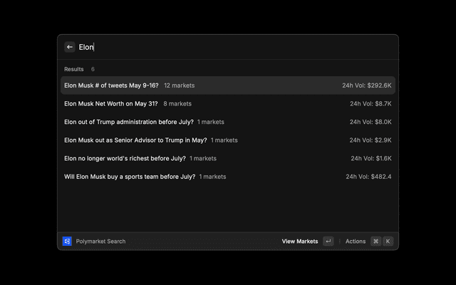 A Raycast extension for searching, viewing, and analyzing markets and trader profiles on Polymarket.com. View market prices, statistics, trader analytics, and trading data directly from Raycast.