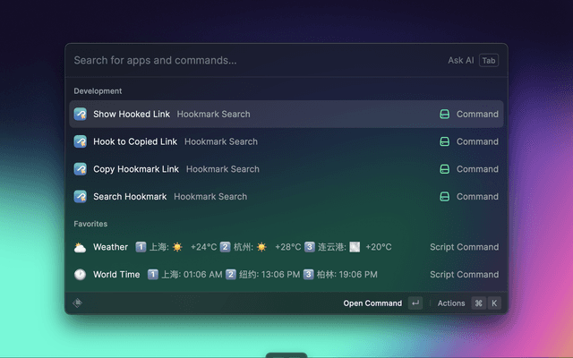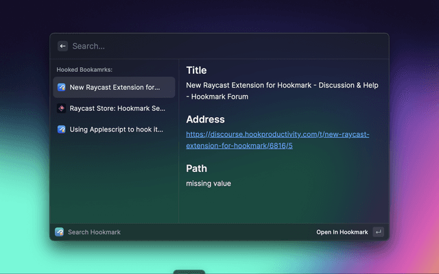 This Hookmark extension aims to provide a bookmarks search UI in Raycast. It is similar to the Free Alfred Workflows for Hookmark – Hookmark workflow in Alfred. You can retrieve all your Hook bookmarks in Raycast.