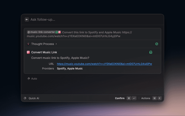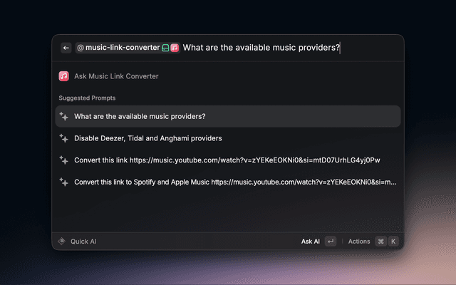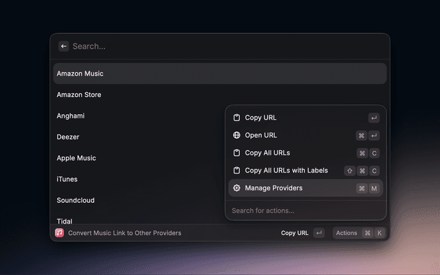 Convert a music link to another provider. For example you can convert Spotify links to apple music links.