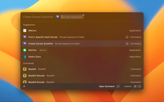 Sometimes we want to use an alias or a Hotkey to quickly launch the searching in a single docset, like search in the react document, in that case you can follow the steps below to create a quicklink for that docset: