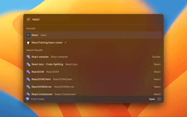 Interface with the Dash application, allowing users to quickly search through documentation sets.