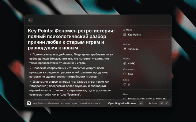 ⌘ ⇧ K | Key Points | Extract key points from the post |