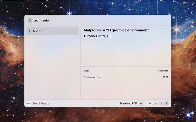 Extension for quickly accessing your bibmanager database from Raycast. Search the database (by bibkey, author, title, year or tags) and quickly access entries by opening or downloading the pdf. You can also open or copy the ADS link and copy the bibtex entry. Make sure to explore available actions in the action panel (⌘ + K).