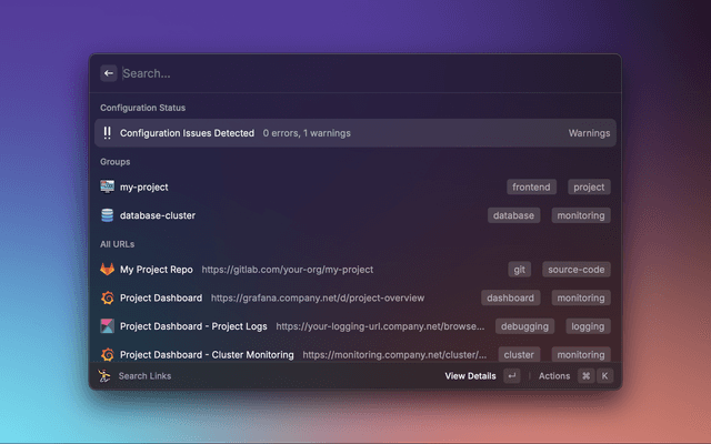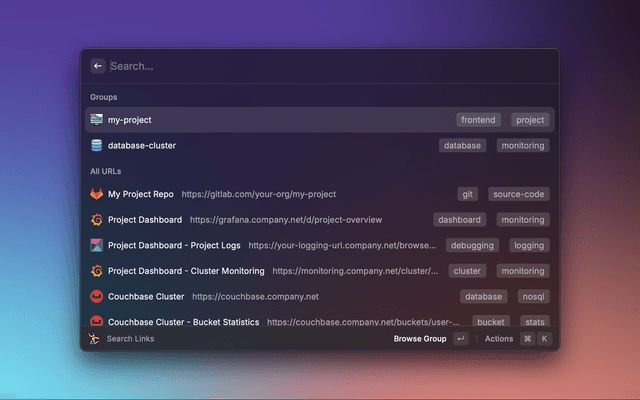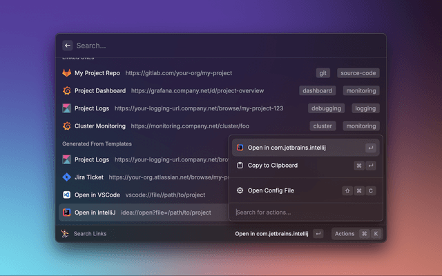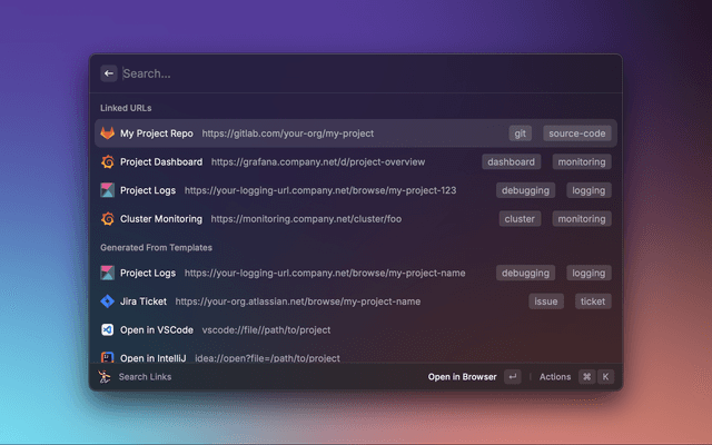 • Powerful Templating: Create dynamic URLs for common patterns (e.g., Kibana logs, Project dashboard, Git Urls) using placeholders.