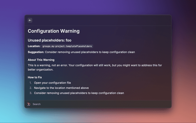 • groups: The main organizational unit. A group can link to shared URLs (linkedUrls), define group-specific URLs (otherUrls), apply templates, and define its own placeholder values. Each group can have an optional title for display purposes (if not provided, the group key is used as the title). URLs in otherUrls can have their own titles, icons, tags, and openIn applications.