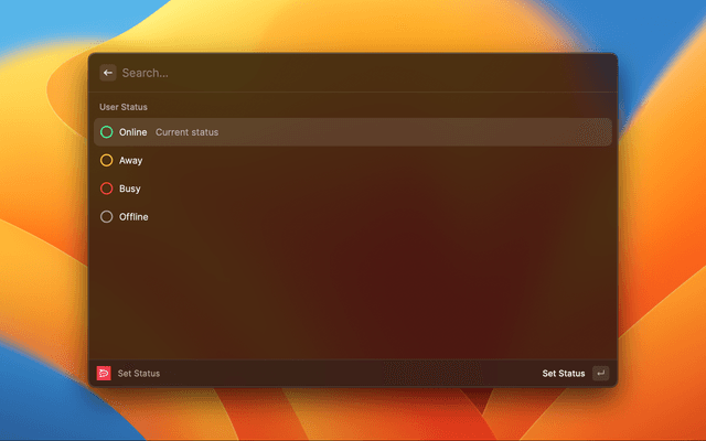 Search for teams, channels, users and set your presence status.