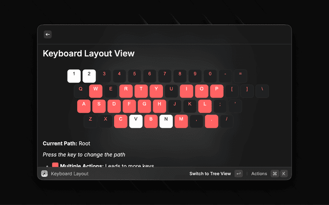 - Aliases Cheatsheet: Visualize your aliases in two formats: an interactive Keyboard Layout View (locked to brand-dark theme) to see your prefix keys at a glance, and a hierarchical Tree View for recursive navigation.