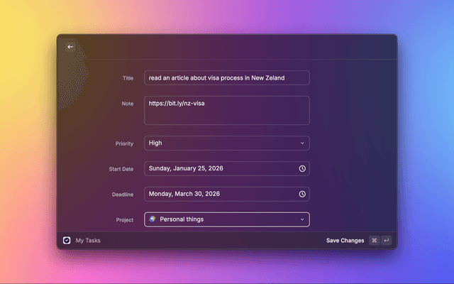 - Create Tasks: Quickly add new tasks with title, notes, priority, dates, and project assignment