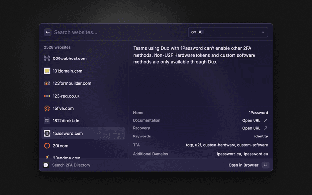 View a list of 2FA enabled sites.