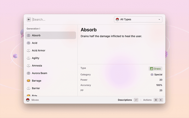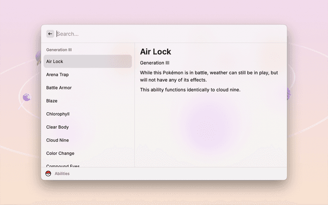 • Moves: Access detailed move information including base power, accuracy, PP, type, category, priority, and more.