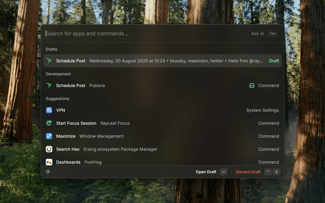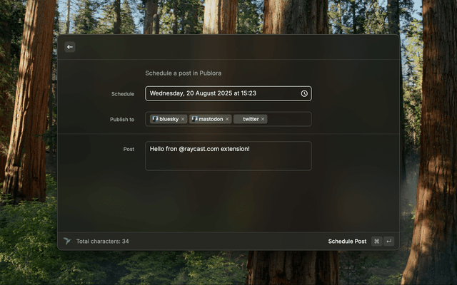 Create and schedule social media posts for Twitter (X), BlueSky, Mastadon, LinkedIn and others through Publora. All through Raycast interface.