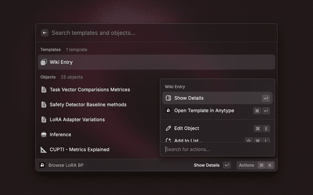 - Interact: Press Enter to view the object in Raycast or Command+Enter to open it in Anytype.