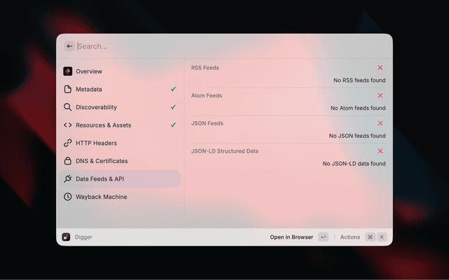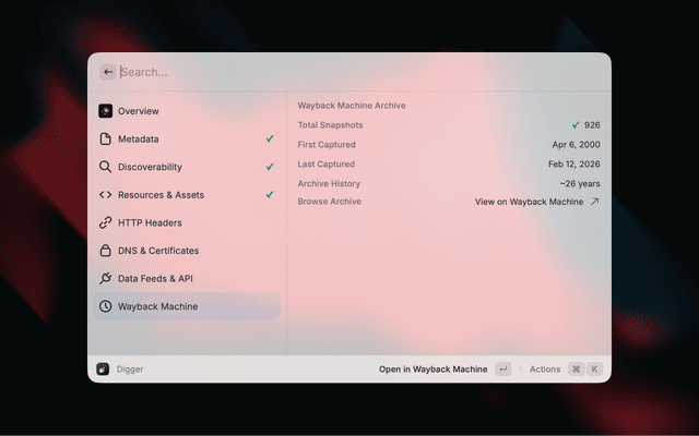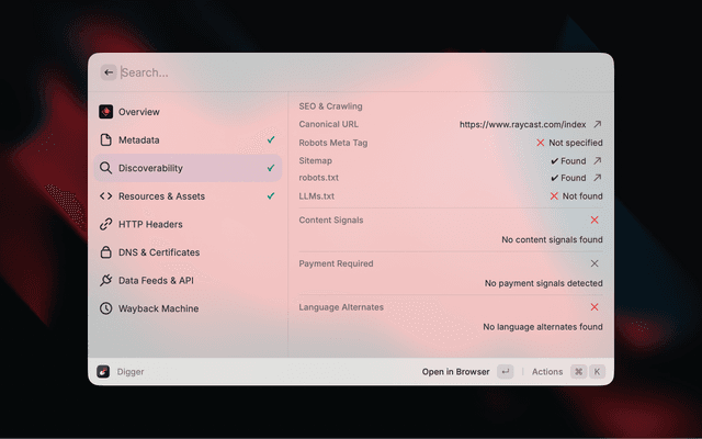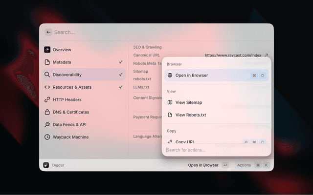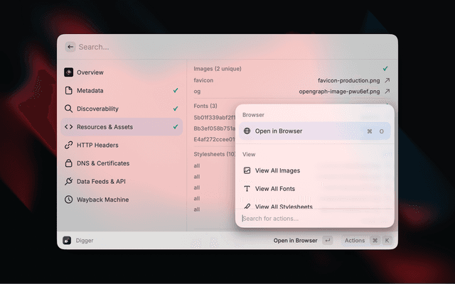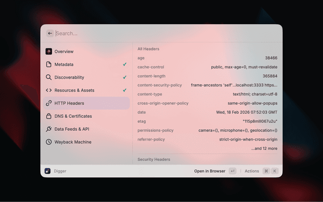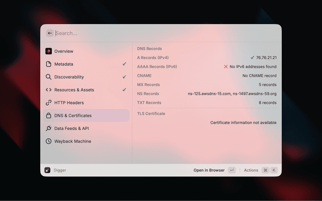Digger surfaces contextual information about any website without needing to open developer tools. Enter a URL and instantly see metadata, SEO signals, security info, DNS records, and more.