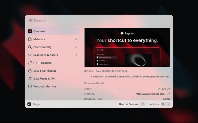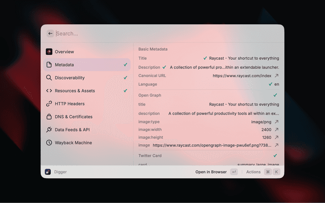 Like dig, but for the web. Comprehensive website intelligence and metadata extraction for Raycast.