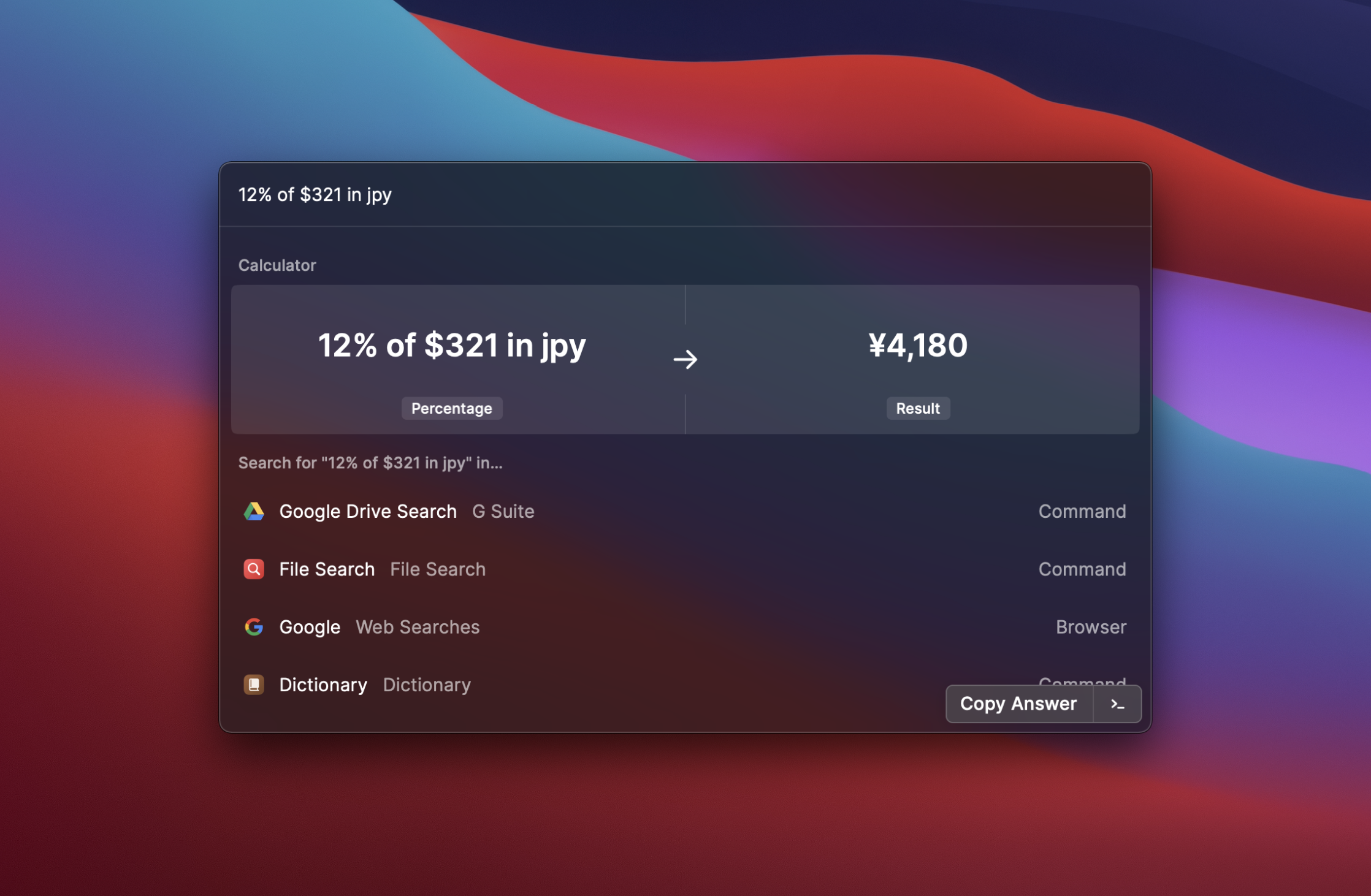 Raycast solves your complex math expressions and supports time zones, unit conversions, dates, and currency – including crypto. The best thing is, it understands your natural language!