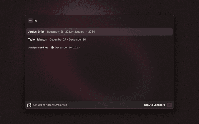 • Get List of Absent Employees: The command gets a list of employees who are out office today.