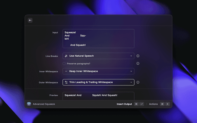 Text from external sources often comes with unwanted formatting: broken line breaks, excessive spacing, or awkward hyphenation. Squeeze helps you quickly clean it up with a few preset commands.