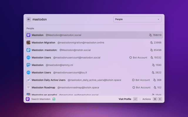 Search for people or hashtags on Mastodon! – This extension is not intended to be a full Mastodon client. Instead, it is a quick and easy way to get glanceable information about people and to navigate to pages on the Mastodon website. It intentionally does not include posting, browsing timelines, mentions, or even post search.