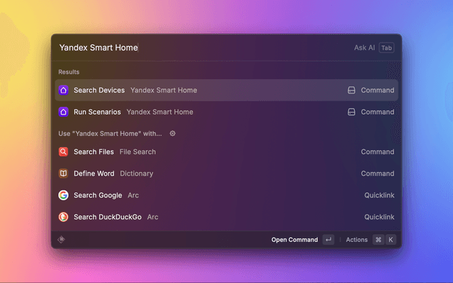 Control Yandex Smart Home devices and run scenarios from Raycast.
