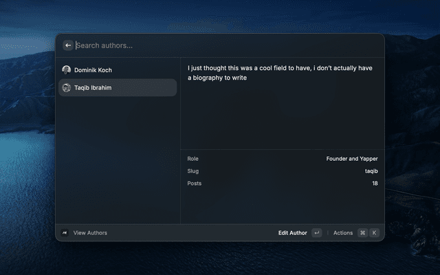 • Authors — Browse, create, edit, and delete authors with bio, role, and social links.