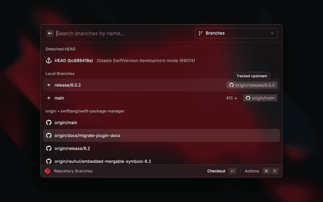 β + 1 to go to Statusβ + 2 to go to Commitsβ + 3 to go to Branchesβ + 4 to go to Tagsβ + 5 to go to Remotesβ + 6 to go to Stashesβ + 0 to go to FilesYou can create a Quicklink to open a specific repository without needing to select it in the Manage Git Repositories list.
