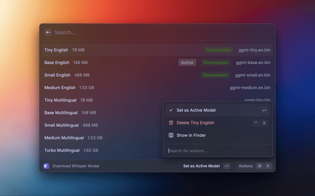 The extension downloader currently supports the following whisper models, however you can download any model you might need from ggervanov/whisper.cpp and configure it's path in the extension's preferences: