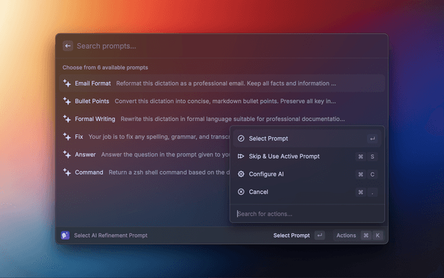 Effortlessly convert your speech to text directly within Raycast using the power of whisper.cpp. This extension provides a simple interface to record audio, transcribe and refine it locally, privately on your machine. Refine the text with custom prompts privately using ollama, or additionally with Raycast AI or any v1 (OpenAI) compatible API.