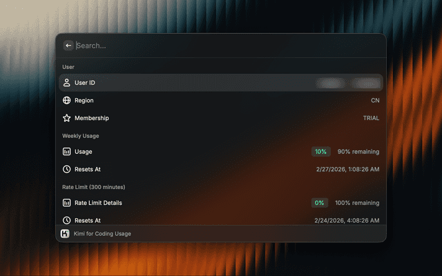 When you first run the command, Raycast will prompt you for your API key. You can find your API key in your Kimi for Coding account settings.