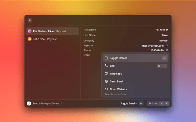 Disclaimer: This is not an official HubSpot product. It is a raycast plugin created by a third party and may not accurately reflect the features and capabilities of HubSpot products. Please refer to the official HubSpot website for accurate and up-to-date product information.
