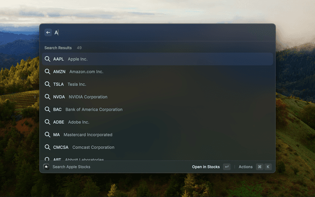 Apple Stocks Extension for Raycast | Works for all stocks that the Apple Stocks app supports and will remember your search history. Currently auto-searches for US S&P 500 companies and past searches. Does not actually display stock prices, but will open the Apple Stocks app to the stock you search for.