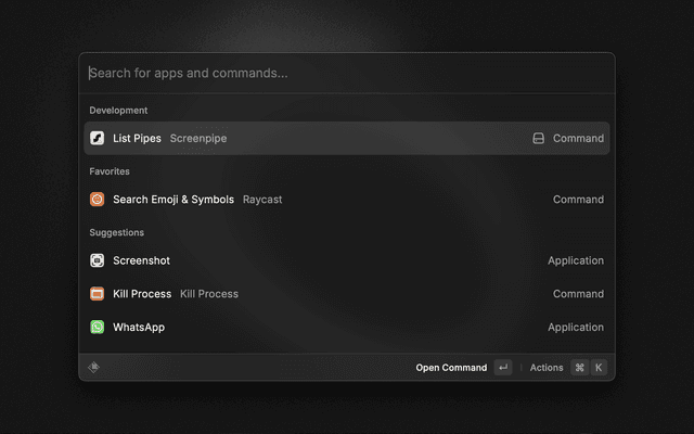 Raycast AIRaycast NotesRaycast FocusClipboard HistoryWindow ManagementSnippetsFile SearchQuicklinksCalculatorCalendarSystemEmoji Picker
