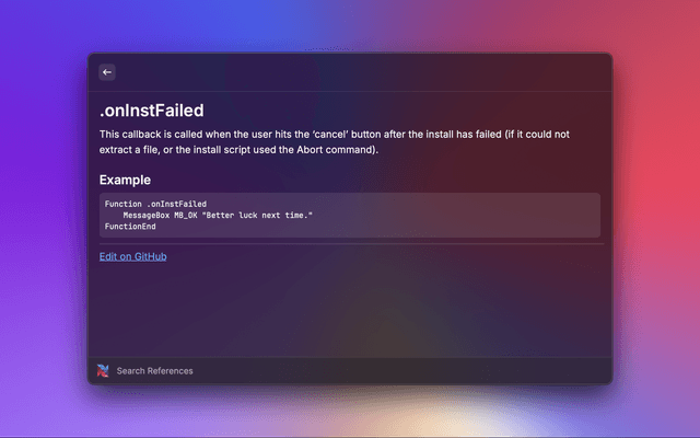 Quickly search through the documentation for Nullsoft Scriptable Install System (NSIS).