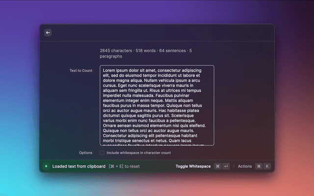Requirements: This feature uses Raycast Cross-Extension and requires the ScreenOCR extension to be installed on your Mac. When you run this command, it will launch ScreenOCR to capture the text and return the results back to Word Count.