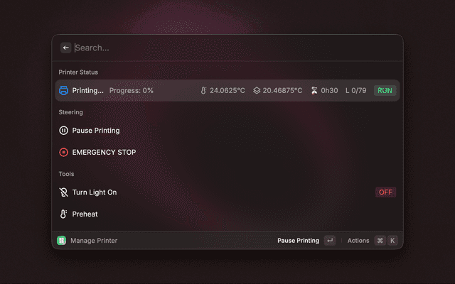 Bambu Lab Controller brings your 3D printer directly into Raycast. Manage your prints, control temperatures, and handle files instantly without breaking your workflow.