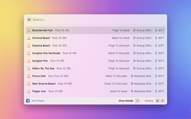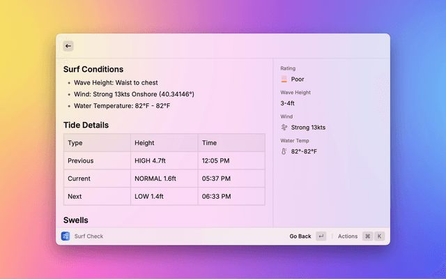 Surf Check is a Raycast extension that provides quick access to surf conditions and forecasts for your nearby surf spots. Using data from Surfline, this extension allows you to check wave heights, wind conditions, water temperature, and more.