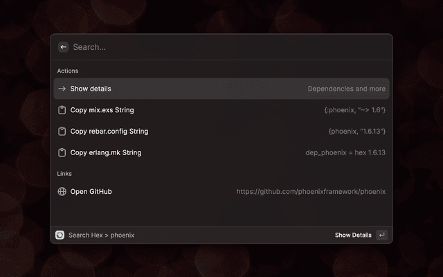 This is a Raycast extension that enables you to quickly look up package information from Hex.