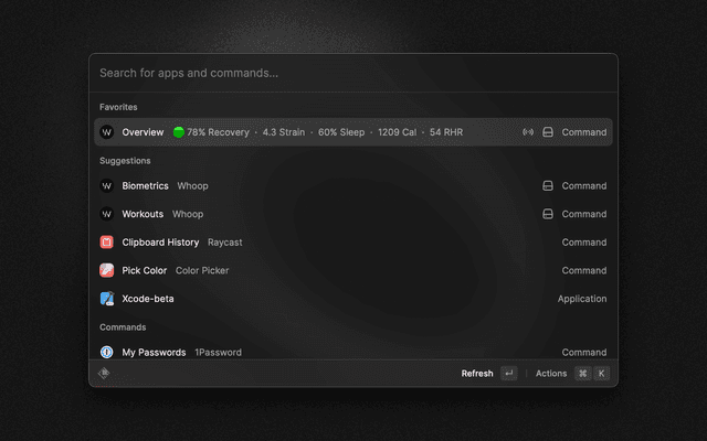 Your WHOOP data, now at your fingertips. Monitor your recovery, sleep, strain, workouts and more! Favourite the Overview command for quick access to your WHOOP data.