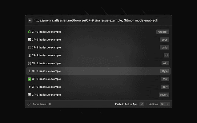 This Raycast plugin allows you to parse your issue urls (such as Jira, GitHub and GitLab) to provide you with a commit name and description that you can use with Git!