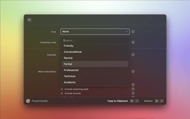 Prompt Builder is a Raycast extension that helps you craft the perfect AI prompts efficiently. It makes it easy to define roles, tasks, tone, audience, and constraints, helping make AI output more accurate and consistent. Build structured prompts with templates, preview them, and copy instantly to your clipboard.