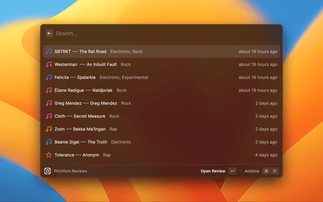 Quickly see the new music releases and album reviews from Pitchfork without opening your browser.