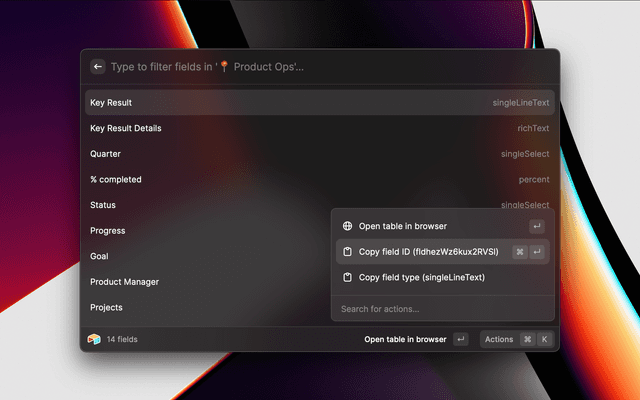 List/filter a table's fields and copy/paste field IDs (similar functionality is available for a table's views)List/filter a table's fields and copy/paste field IDs