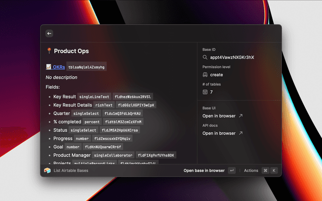 Preview base details including a list of tables, fields, and links to open the base and API docs in your browserPreview base details including a list of tables, fields, and links to open the base and API docs in your browser