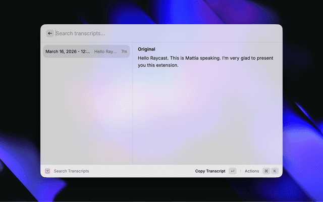 | Search Transcripts | Browse history, copy, save, delete, reveal in Finder |