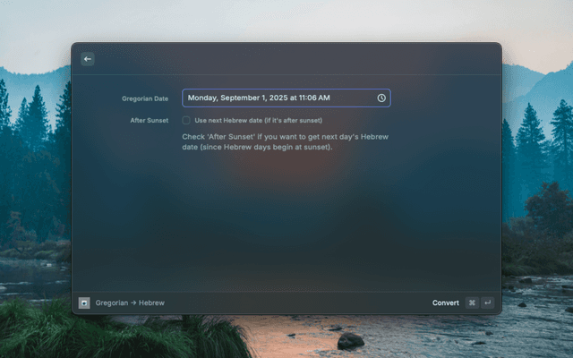 - "After Sunset" option - Handle Hebrew day transitions properly (Hebrew days begin at sunset)