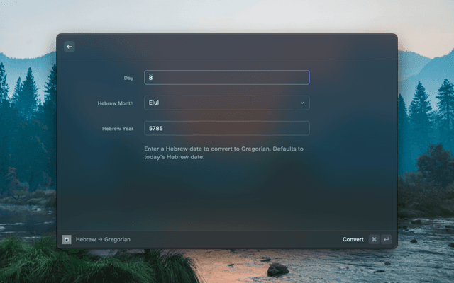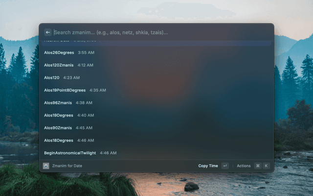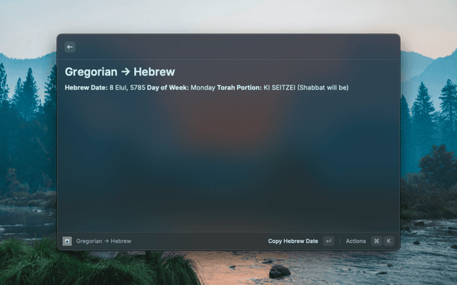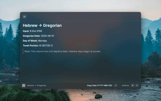 A comprehensive Raycast extension for Hebrew/Jewish calendar conversions and zmanim (halachic times) calculations, powered by the KosherJava library.