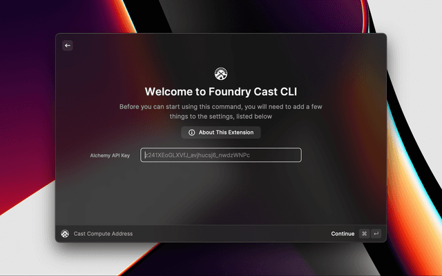 Additionally, you will need an Alchemy API key to use the commands that require RPC connections. This is used in order to provide every Cast functionality on Mainnet, Optimism, Arbitrum and Polygon. You can create an account and get a free API key here.