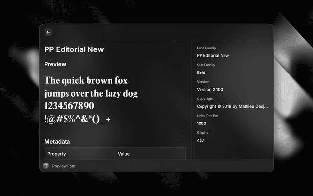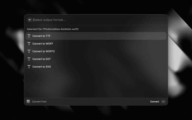 Convert any font between TTF, OTF, WOFF, WOFF2, EOT, and SVG formats directly from Raycast